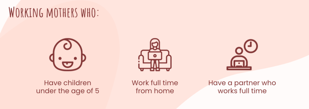 We were interested in examining mothers who have children under the age of 5 (not school aged yet) who work full time from home and who have a partner / husband who works full time. We wanted to know what impacts the pandemic has had on mothers of young children, and how they have managed to balance (or not) the new demands and lack of support available. We wanted to understand their day-to-day challenges.