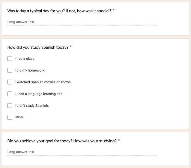 I used a diary study with one participant who took two Spanish classes in adult school to capture the participant’s everyday Spanish learning experience. I used a diary study because other interviewees said they only studied one day a week and wanted to know if a student with two classes has different study habits. I wanted to know what the participant experienced every day in her Spanish learning routine.
